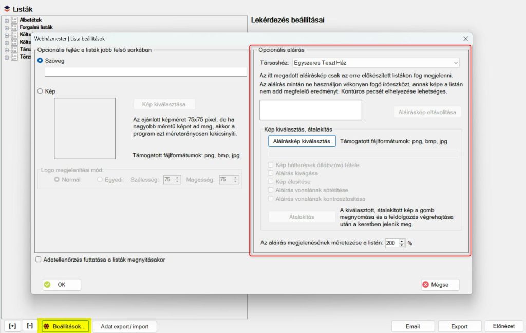 A Listák modul beállításaiban lehetőség van aláírás kép feltöltésére, amely megjeleníthető a lekért kimutatások aláírás szekciójában.