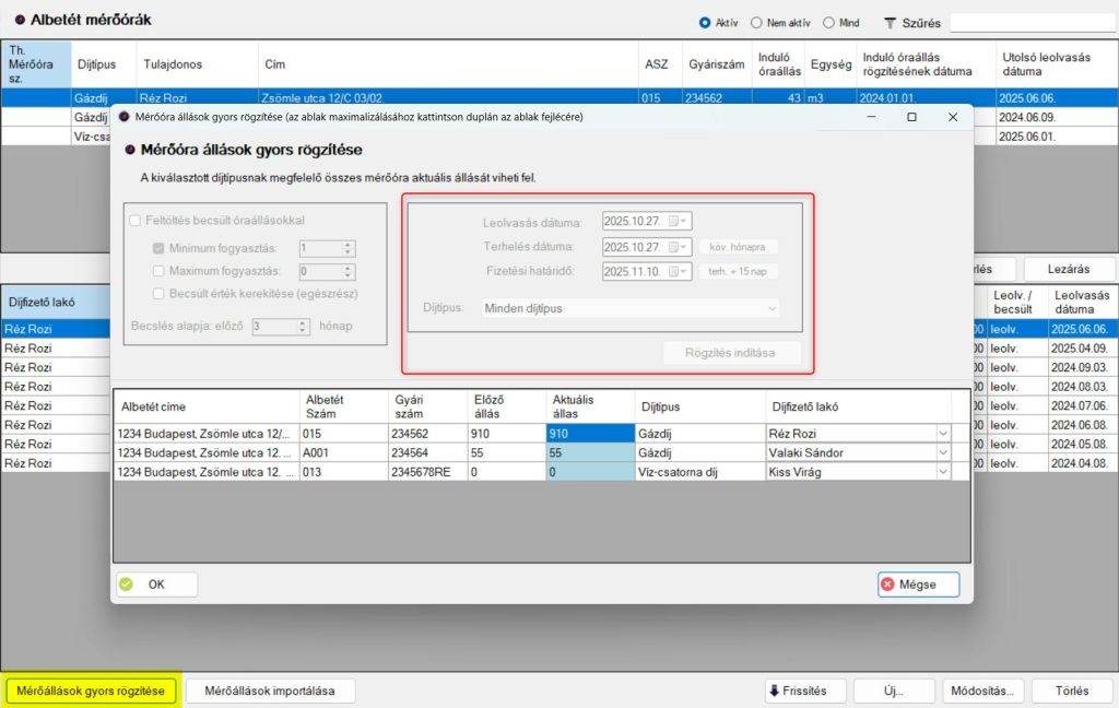 A mérőóra állások gyorsrögzítése funkció elindítható egyszerre az össze díjtípusra, azaz minden típusú mérőórához egyszerre fel lehet vinni az óraállásokat.